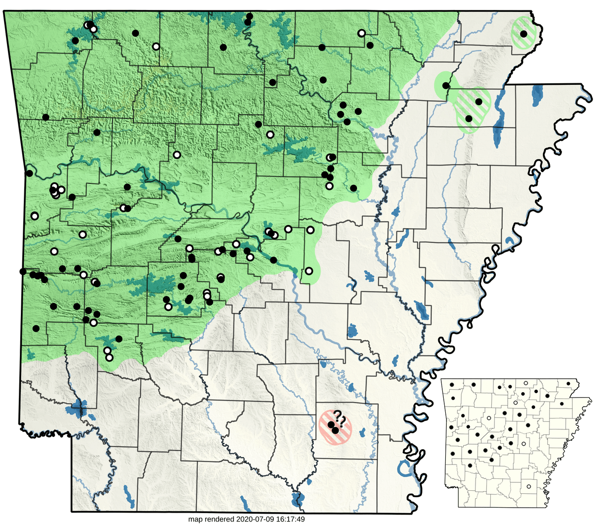 This species is represented by 128 records from 23 sources: 78 museum (), 0 literature (), 0 research (), and 43 observation (), with 7 additional Trauth et al. (2004) locality points remaining unsourced (). It has been museum vouchered for 28 of 75 counties (), with 5 additional counties having other forms of reported occurrence (). Years of collection range from 1898 to present.