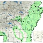 This species has a spotty distribution throughout the Mississippi Alluvial Plain and eastern Arkansas Valley, with limited documentation in the South Central Plains from the backwaters of the Little, Ouachita, Red, and Saline Rivers. It is likely undersampled throughout its range. A historical record from Nimrod Lake, Perry County (RAD 1802 from 1965), is likely valid, as K. J. Irwin has captured several unvouchered specimens in the Fourche River floodplain at Harris Brake Wildlife Management Area, Perry County (pers. obs.).